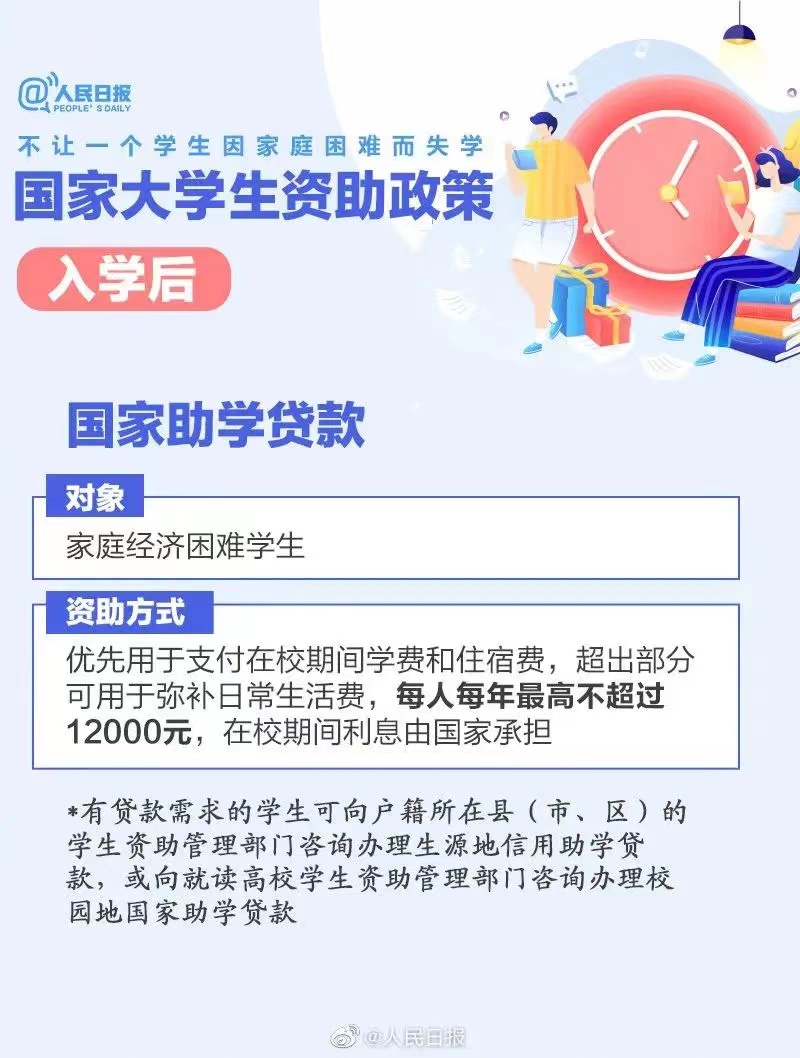 除了国家助学贷款,还有新生入学“绿色通道”、国家励志奖学金、国家助学金等高等教育本专科阶段资助政策,求学路上不发愁!