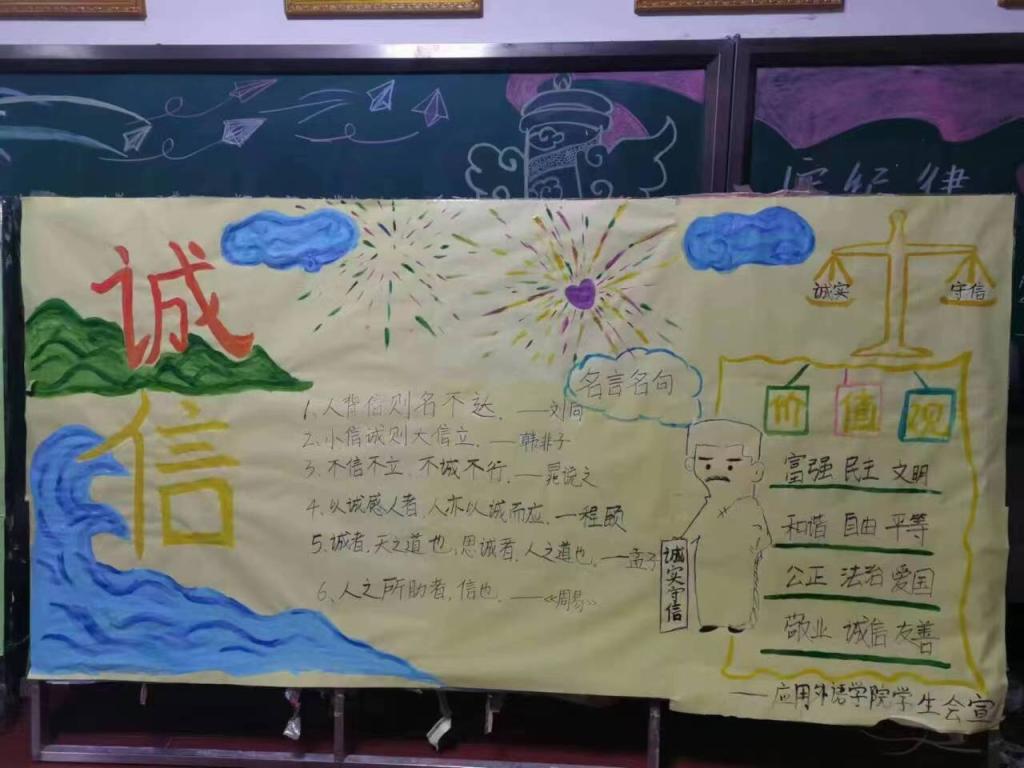 为了培育和践行社会主义核心价值观,大力弘扬诚信文化,切实提升学生的诚信品质、自律意识和社会责任感。应用外语学院于11月通过画报展板,主题班会等形式组织学生开展诚信教育活动。