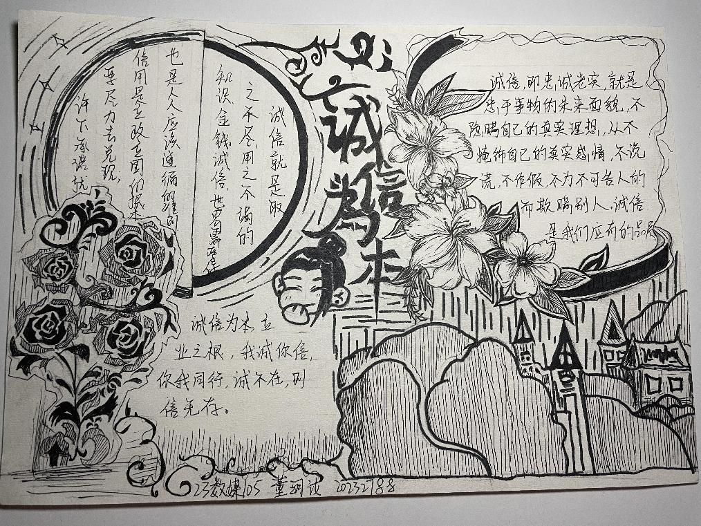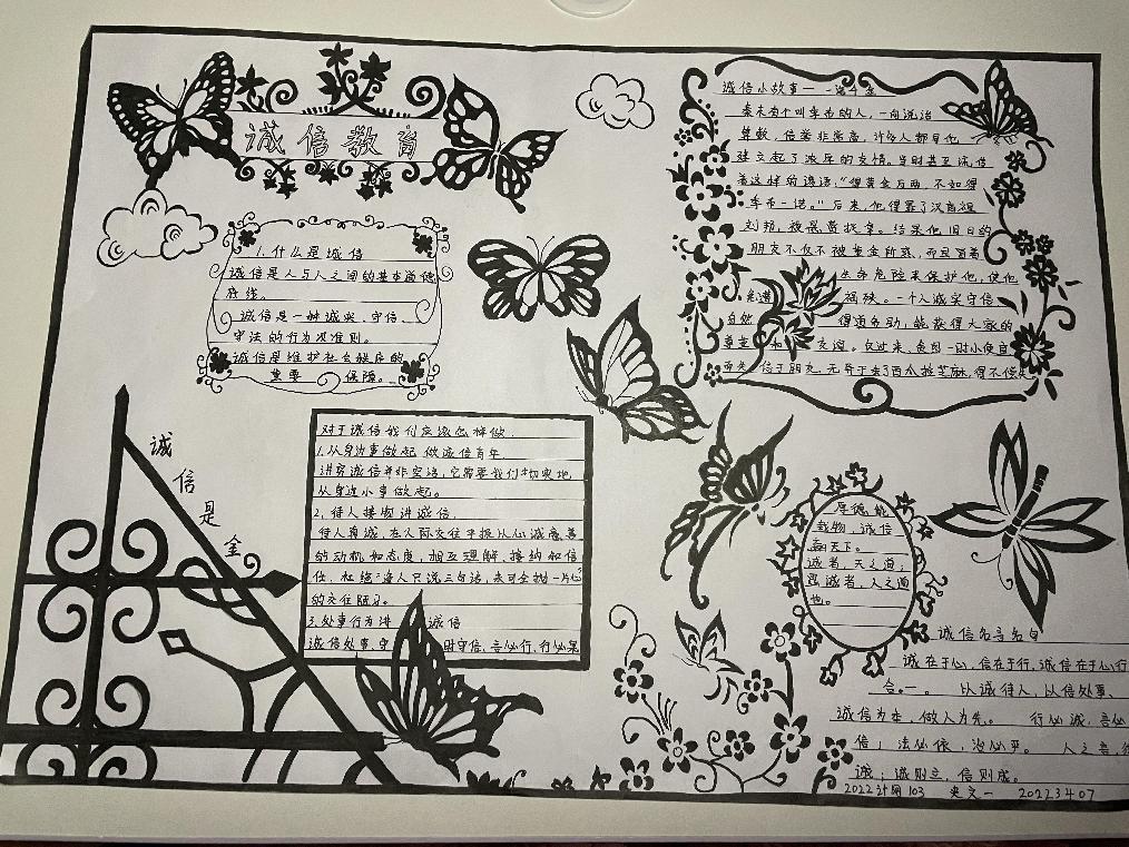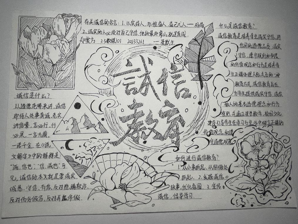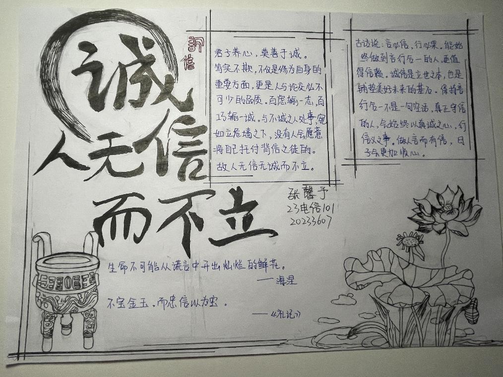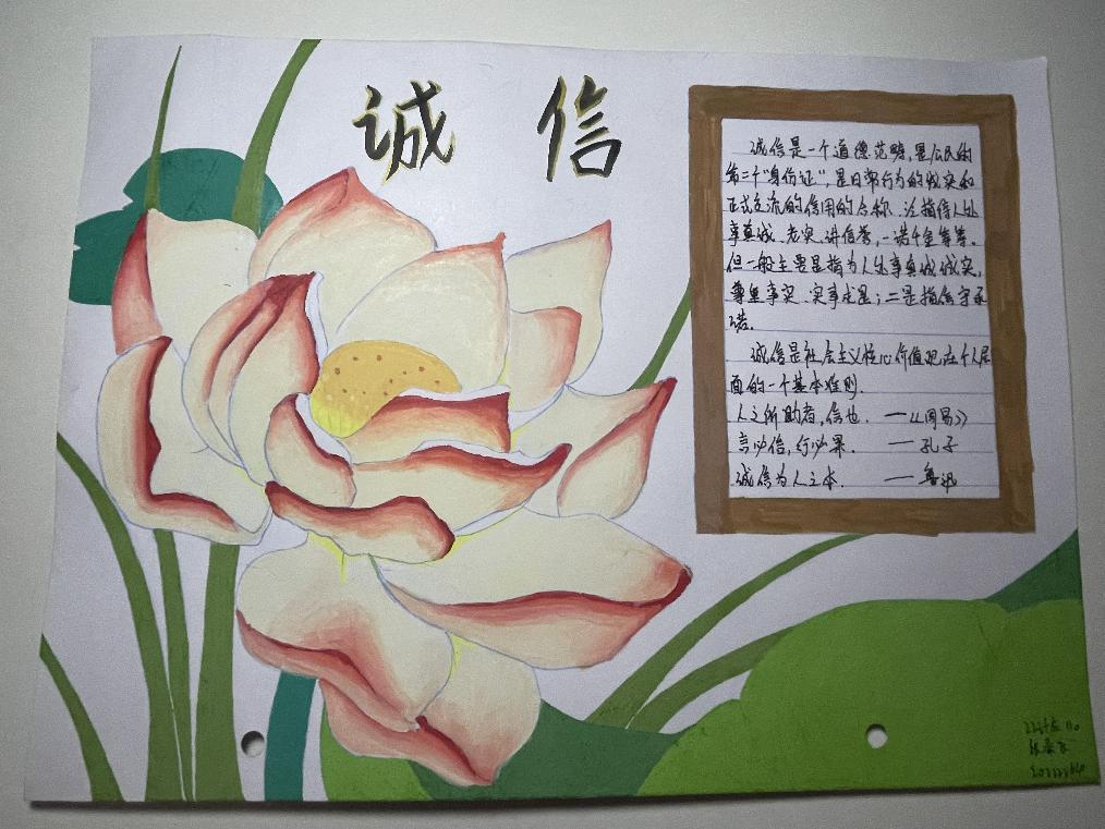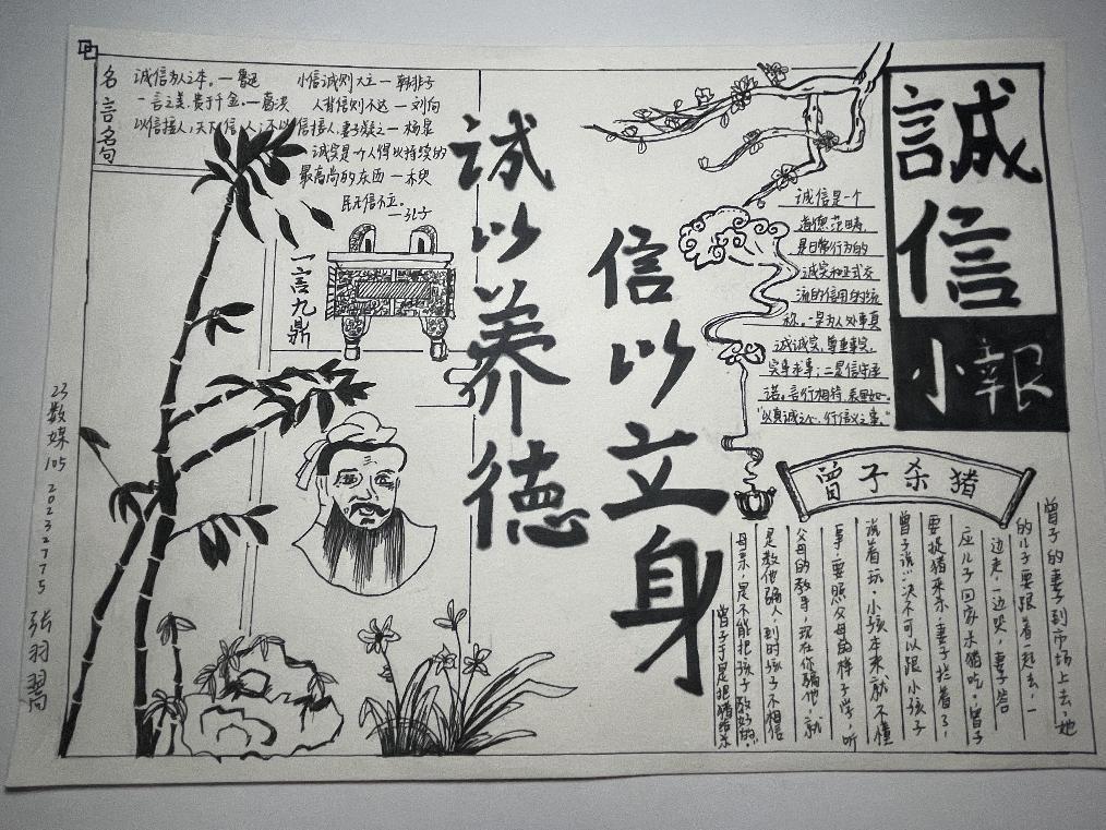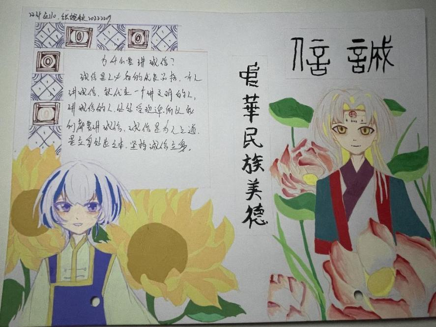 诚信是中华民族的传统美德,也是社会主义核心价值观的重要内容,更是当代大学生塑造健康人格,实现人生价值的道德基石。为不断塑造大学生的诚信品质,进一步推进大学生思想政治教育工作,促进资助政策的充分宣传和有效落实,2023年11月13日-15日,我院认真落实学校关于资助诚信教育主题活动的文件精神,结合大学生核心素质培养和实际工作,在全院范围内开展了“绘制诚信教育主题手抄报”的诚信教育活动。活动期间,同学们踊跃报名,积极参加,形成了良好的宣传教育氛围。此次活动中共有十位同学表现优异,荣获奖项。
