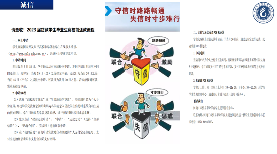 资助专员陈海芳老师在诚信感恩教育活动中给同学们强调了诚信感恩对人的重要性,“守信时路路畅通,失信时寸步难行”。强调同学们在校期间,诚信就是真诚待人,认真做事,不做虚假学问,诚信考试以及诚信贷款等。只有努力做到这些,才称得上是一个诚信的大学生。从长远来讲,要构建诚信社会、和谐社会,作为新一代的接班人,必须首先讲求诚信。诚信做人不仅是个人的自我要求,同时也是社会对每个人的要求。感恩亦是当代社会着重强调的美德之一,学会感恩,就是要学会懂得尊重他人,对他人的帮助时时怀有感激之心,应以感恩作为每个人应有的基本道德准则和做人的起码修养。