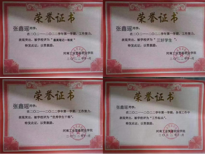 她在2021-2022学年,工作努力,表现突出,荣获我们学院“优秀学生干部”的称号同时也是“三好学生”!在班级内担任团支书,工作认真,深受同学和老师的喜欢,被评为“优秀班干”和“工作标兵”,也获得了不少荣誉。