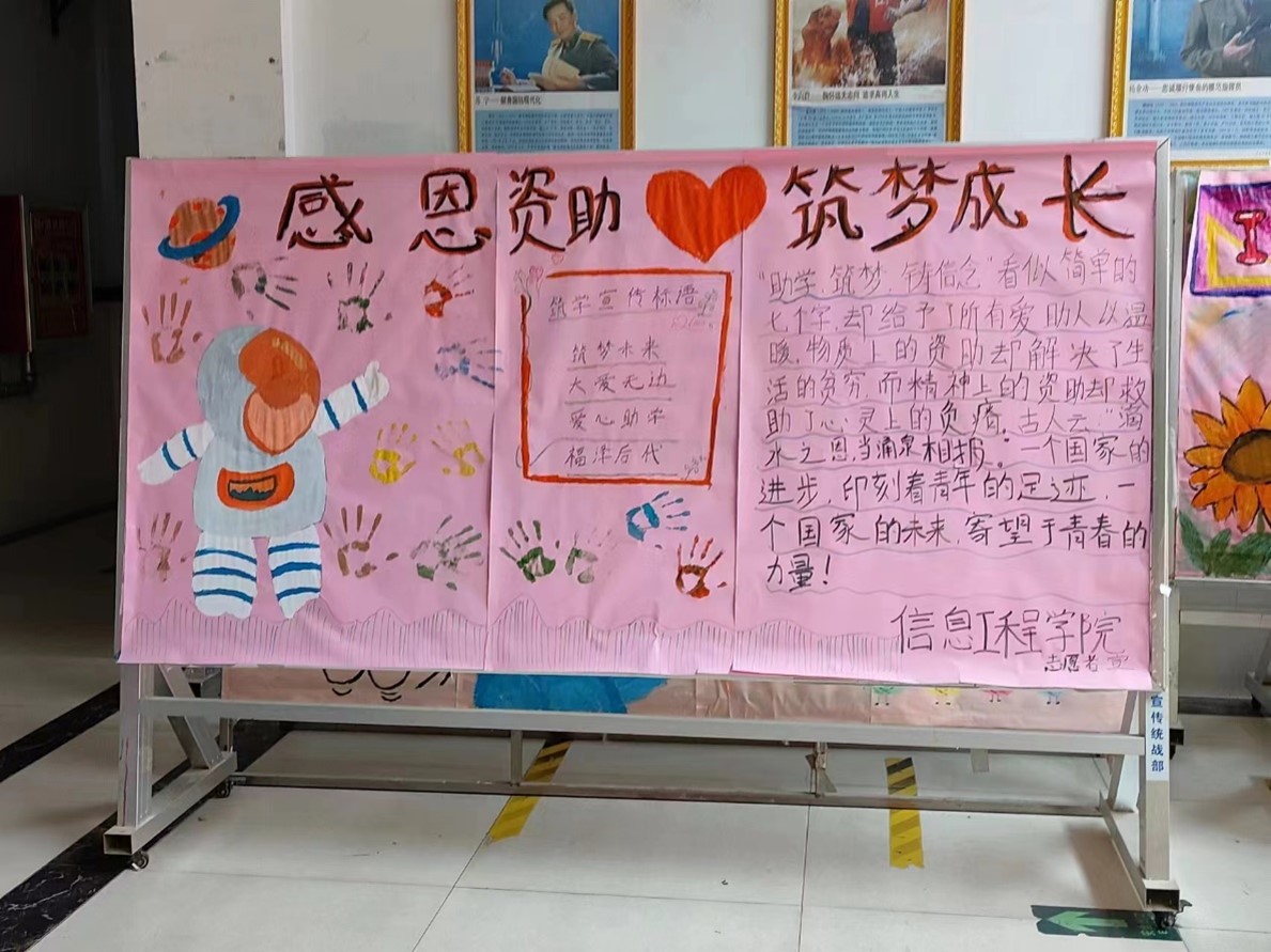 为进一步推动我校学生的思想政治教育工作,促进资助政策的充分宣传,塑造学生的感恩品质,信息工程学院志愿者组织进行了以“感恩资助,筑梦成长”为主题的板报绘制活动。此次活动目的为强化学生对国家社会的感恩情感。