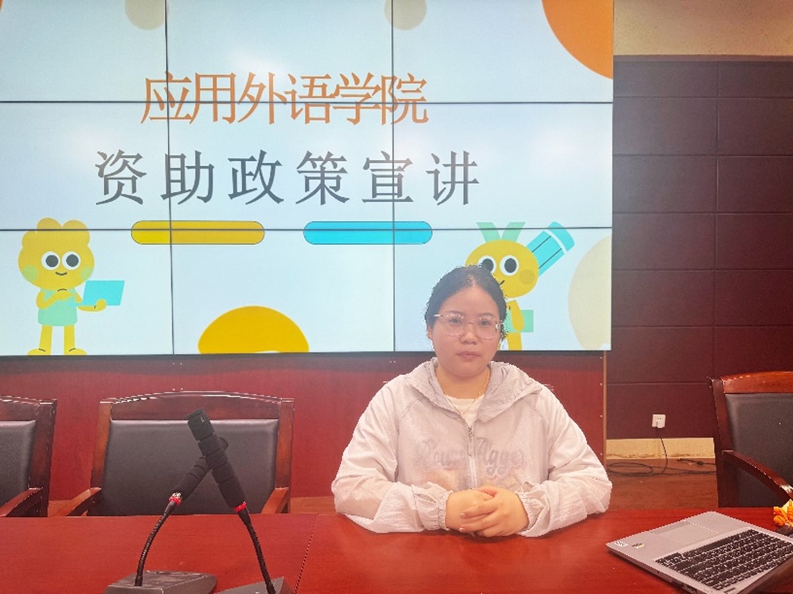 为全面落实立德树人根本任务,加大国家资助政策宣传力度深入推动资助育人工作,进一步激励广大受助学生诚实守信、奋发自强、立志成才、感恩奉献,提升资助育人成效,应用外语学院于6月4日在3101教室召开“资助育人 筑梦成长”学生资助政策宣讲专题讲座,由辅导员陈丹蕾主讲,学院全体学生参与。