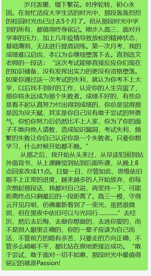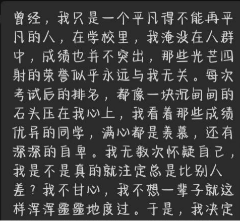 在专访中,同学们纷纷回忆起了自己成长路上的点点滴滴。他们用笔触描绘出那些汗水与泪水交织的日子,也分享了欢笑与收获的喜悦。这些真实的经历,不仅是对自己成长的回顾,更是对他人的一种鼓舞和激励。他们用自己的故事告诉我们,只有不断学习、进取,提升知识和技能,才能为未来的成功奠定坚实的基础。同时,这些故事也帮助同学们明确了人生方向,制定了清晰的职业规划,为实现全面发展提供了有力的支持。