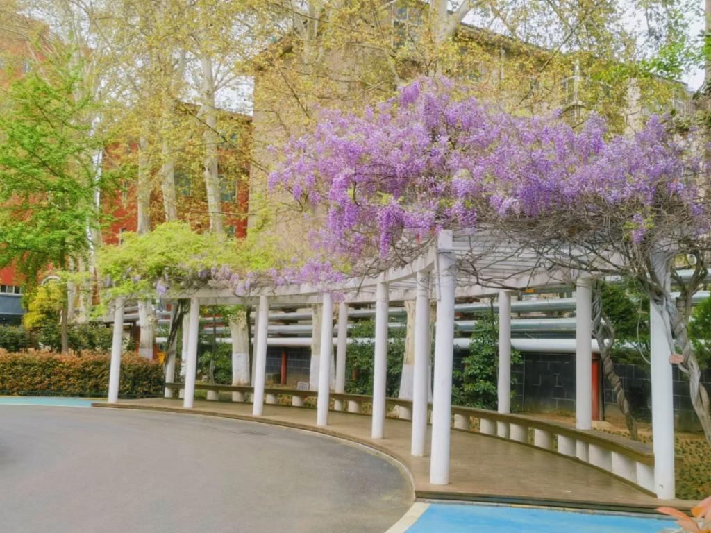 社区最奢华的装置艺术,当属连接一站式与教学楼的紫藤长廊。百十串紫藤如瀑布般垂落,静谧而壮丽。白柱静立花影间,似与紫藤细语岁月。微风携香而来,引得学子纷纷驻足,沉醉于这如诗景致,与蜜蜂振翅声交织成春日的旋律。
