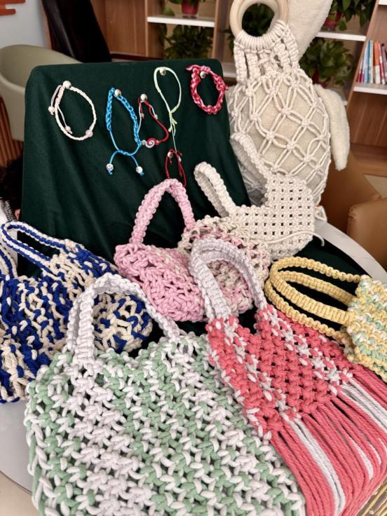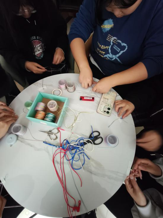 同学们围坐在一起,手持彩绳认真尝试。编织过程中,大家不断的交流技巧 ——“这个雀头结怎么总编歪呀?”“你看我这个配色是不是太鲜艳了?” 吴老师耐心解答疑问,还鼓励大家大胆创新:“非遗不是一成不变的,你们可以把喜欢的元素加进去,让绳编变成有‘校园记忆’的作品。” 现场欢声笑语不断,彩绳在指尖翻飞,一个个精致的绳编作品逐渐成型,成就感在同学们心中悄然绽放。