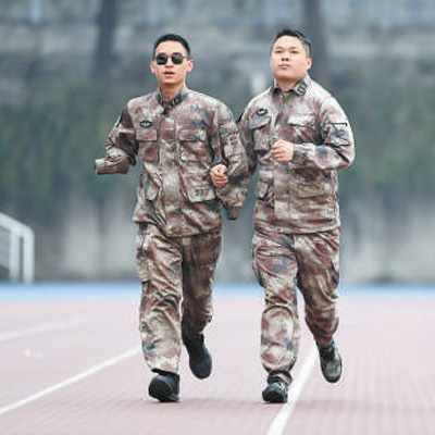 2020年1月2日,“排雷英雄战士”杜富国(左)和战友在陆军军医大学操场上跑步。新华社记者 王全超摄