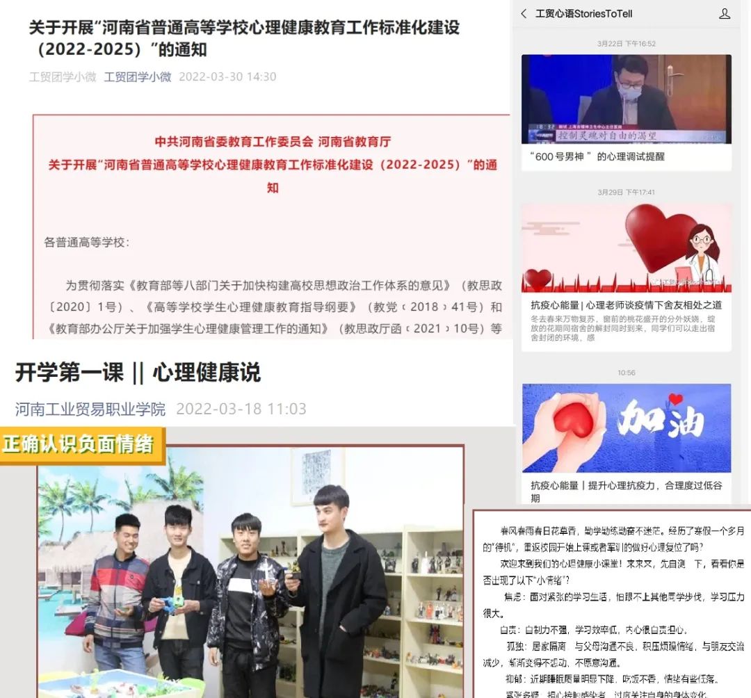 软熏陶、塑环境、重评价。疫情期间,多次通过校官网、微信公众号等方式,作出大学生日常心理咨询工作提示,发布学校及各二级学院心理工作老师的手机号码、办公电话,开启特殊紧急心理问题24小时应急处理机制。校党委委员、副校长刘卫红一线指导参与,利用工作和值班时间和多名学生面对面开展一对一心理咨询帮助。在2021年心理健康月和心理健康周活动中,分别以“让阳光照进心灵”和“护航青春成长,礼赞建党百年”为主题,组织开展心理健康宣传活动。利用“工贸心语”平台,开展“点带面”心理抗疫知识宣传。注重过程评价和结果运用,全方位动员,校本级和二级学院对照省定心理健康教育工作《标准》认真开展自评自查,查摆工作中的突出问题和薄弱环节,以查促建,以评促优,明确建设及整改时间表、路线图,切实加强科学管理和工作保障。