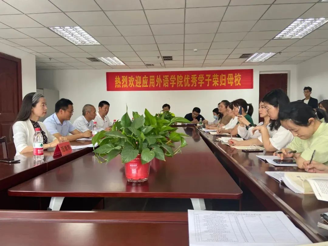 为了欢迎李杨重返母校,应用外语学院举办了校友座谈会。学校分管校友会筹建的副校长于学军、应用外语学院院长范勇慧、党总支书记李松奇和部分教师代表、学生代表等参加会议。