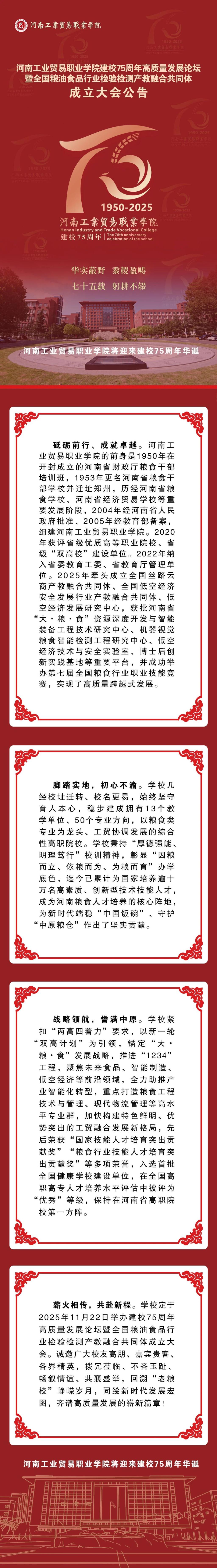 河南工业贸易职业学院建校75周年高质量发展论坛暨全国粮油食品行业检验检测产教融合共同体成立大会公告