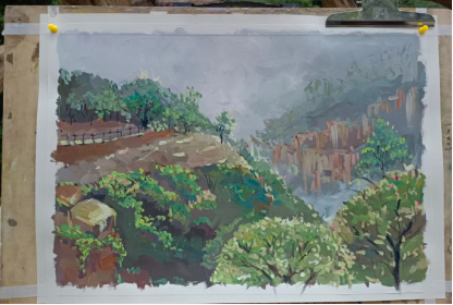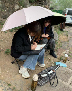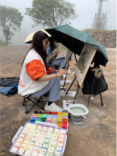 小雨阻挡不了同学们的绘画热情,大家带着雨伞,在山路、在林间,用饱含热情的艺术画笔来描绘自然的美景,通过线条和色彩尽情抒发自己对大自然的热爱。