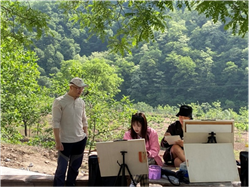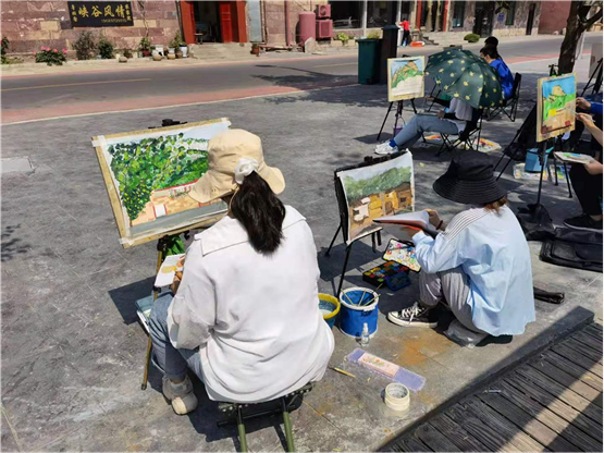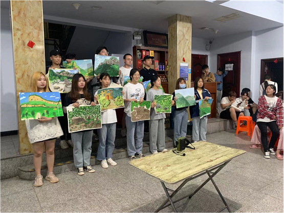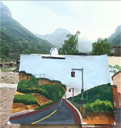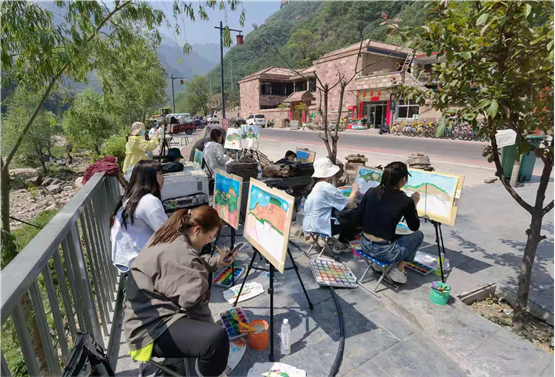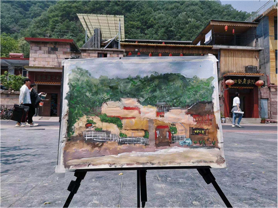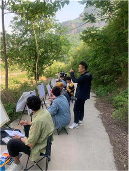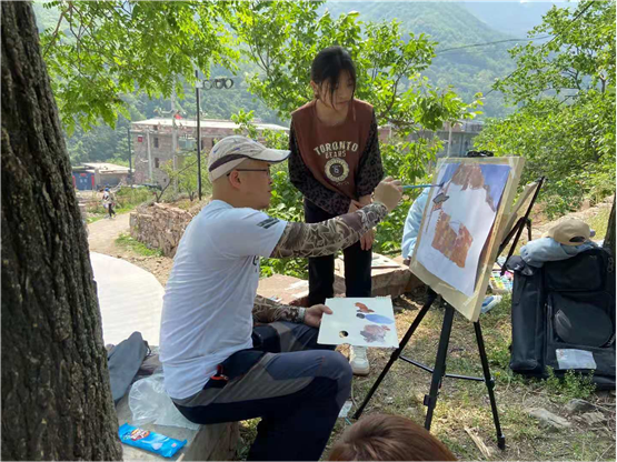 各位专业老师们带着学生们写生踩点,师生踏着轻快的脚步,寻找高低错落、色彩呼应、空间远近对比的点,过程中也了解了石板岩的乡土人情,师生一起作画,老师走到每个学生写生点进行示范和指点。