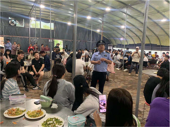晚饭过后,石板岩派出所的民警到基地对同学们进行安全教育,提醒大家:一是不随便扫二维码,不轻易给身边人进行大额转账;二是不去危险地方,不在宿舍吸烟,注意防火防盗安全;三是不与当地人及游客发生冲突。