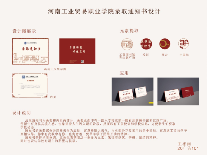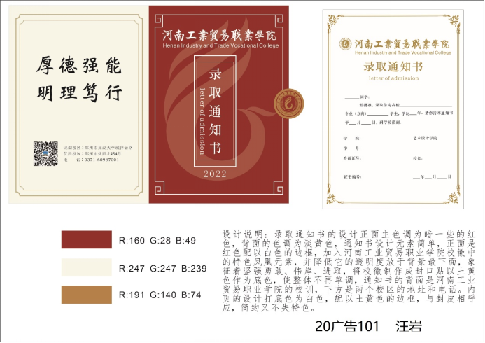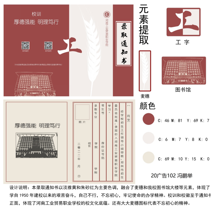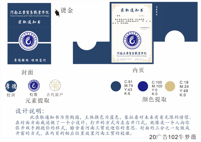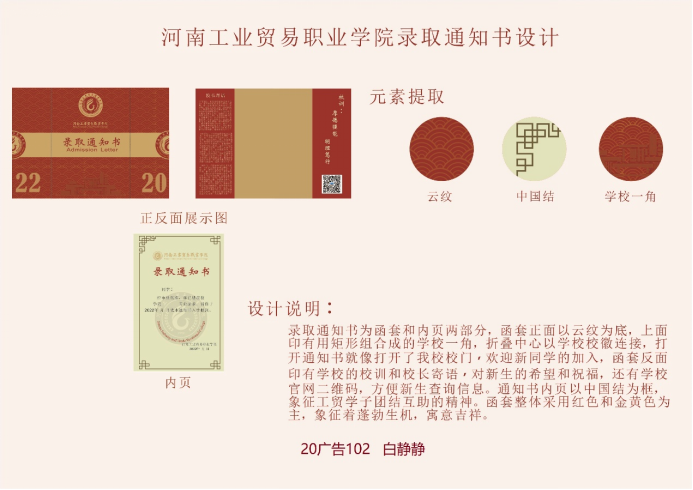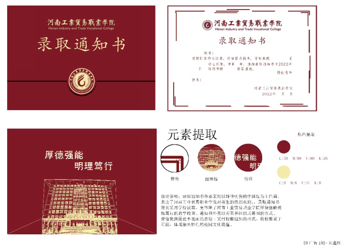 本次大赛的活动主题为“我为学校做贡献”,通过设计录取通知书,展现同学们的设计能力,表达同学们对学校热爱之情。本次活动共收到“录取通知书设计”20余件作品,同学们用手中的画笔和设计创意描绘出自己心目中的校园,以一纸通知书展现对学校的感情。投稿的通知书设计作品造型精美,设计极具创意,充分体现出了艺术设计学院同学们的创新思维与实践能力。