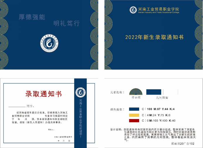 为进一步提高我院学生的设计水平,展现当代大学生的设计风采,将学习的设计知识,转化成一种能力,运用到日常的生活和学习中,更好的促进设计类学生的就业创业。艺术设计学院于5月初,举办了“未”你而来——作品展风采,技能促就业,艺术设计学院 “2022级录取通知书设计”大赛活动。