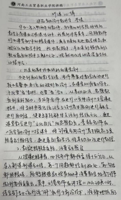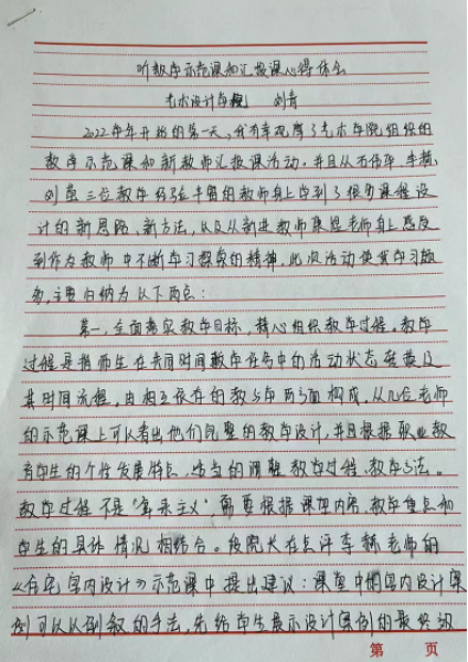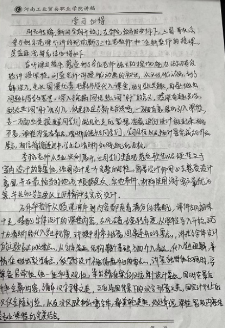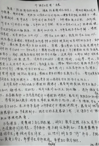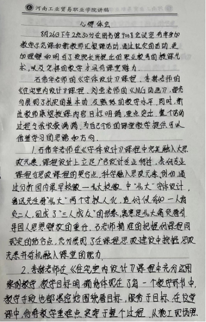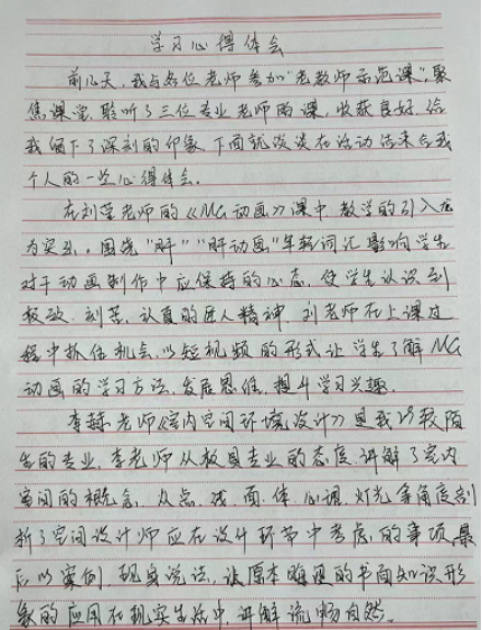 艺术设计学院近3年入职的教师,根据8月26日学院开展的示范课和汇报课的要求,以手写心得体会的方式,进行了观摩汇报。各位新进教师纷纷表示通过此次观摩会,不仅开阔了视野,学到了很多职业教育的新理念、新思想、新技术、新手段,同时也在思想上受到了极大地鼓舞;不仅从老教师身上,学到了很多教学经验,同时,也更加热爱教师这份职业,会把学到的教育教学理念运用到今后的课堂教学中,并大胆对教学进行改革、创新,不断提高自己的教学质量,为学校双高建设作出应有贡献!