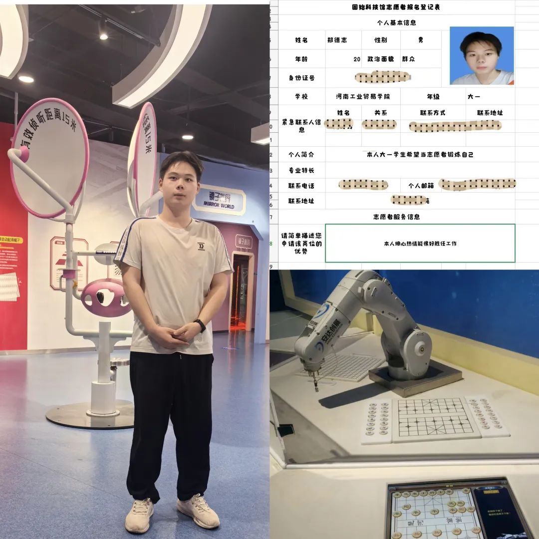 7月5日至25日,24室内106班郑德志同学在固始科技馆担任志愿者,20天的展厅引导、秩序维护与展品讲解,让他经历了从手忙脚乱到从容应对的蜕变。面对小男孩“水为什么能让灯亮起来”的追问,他用“水流推水车转像推玩具车动”的类比化解难题;用“荡秋千”解释势能转化,拿“吸管喝饮料”说明大气压……他逐渐懂得,科普不是高高在上的知识传递,而是用真诚搭建桥梁。“志愿服务是双向成长,我帮大家触摸科学温度,也学会了耐心与变通。”