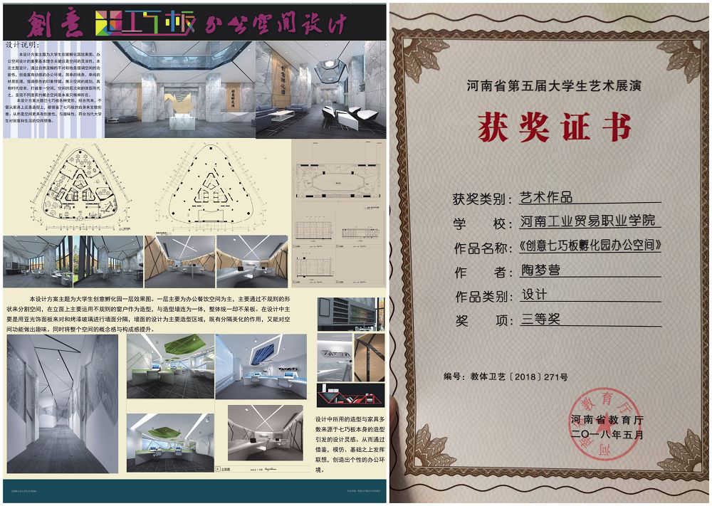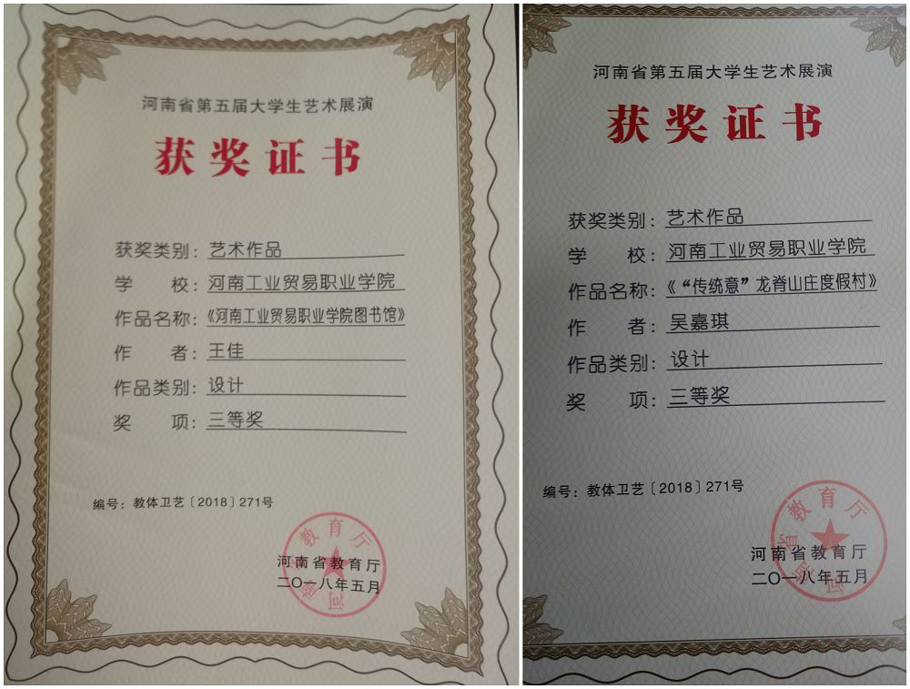 近日,河南省教育厅下发了《关于河南省第五届大学生艺术展演活动评奖结果的通报》以及相关荣誉证书(教体卫艺〔2018〕271号),艺术设计系师生在本次展演活动中荣获多个奖项。