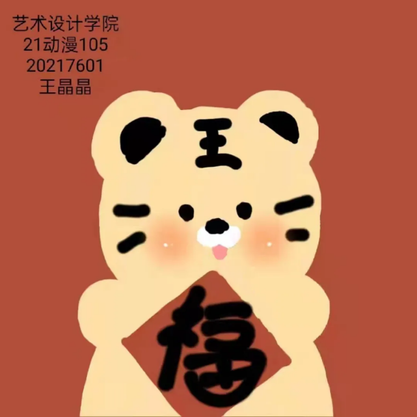 “爆竹声中一岁除,春风送暖入屠苏。”我们在2021号列车下车,踏上了2022号列车,开启我们新一年的旅程。在一节节车厢中,即将装载我们未来的美好记忆。让我们在这辞旧迎新的虎年中,换上艺术设计学院动漫制作技术专业同学们创作的虎年的可爱头像吧!20动漫101丁凯洋20动漫101刘嘉仪20动漫101毛祥宇20动漫102陈昱甫20动漫102李奕扬20动漫102杨金雨21动漫101宋盼盼21动漫101张子豪21动漫102贺菊美21动漫102胡心韵21动漫102景舜尧21动漫102任双璐21动漫102任雨橦 21动漫102任雨橦21动漫105蒋铠西21动漫105刘富豪21动漫105王晶晶21动漫105郑建松