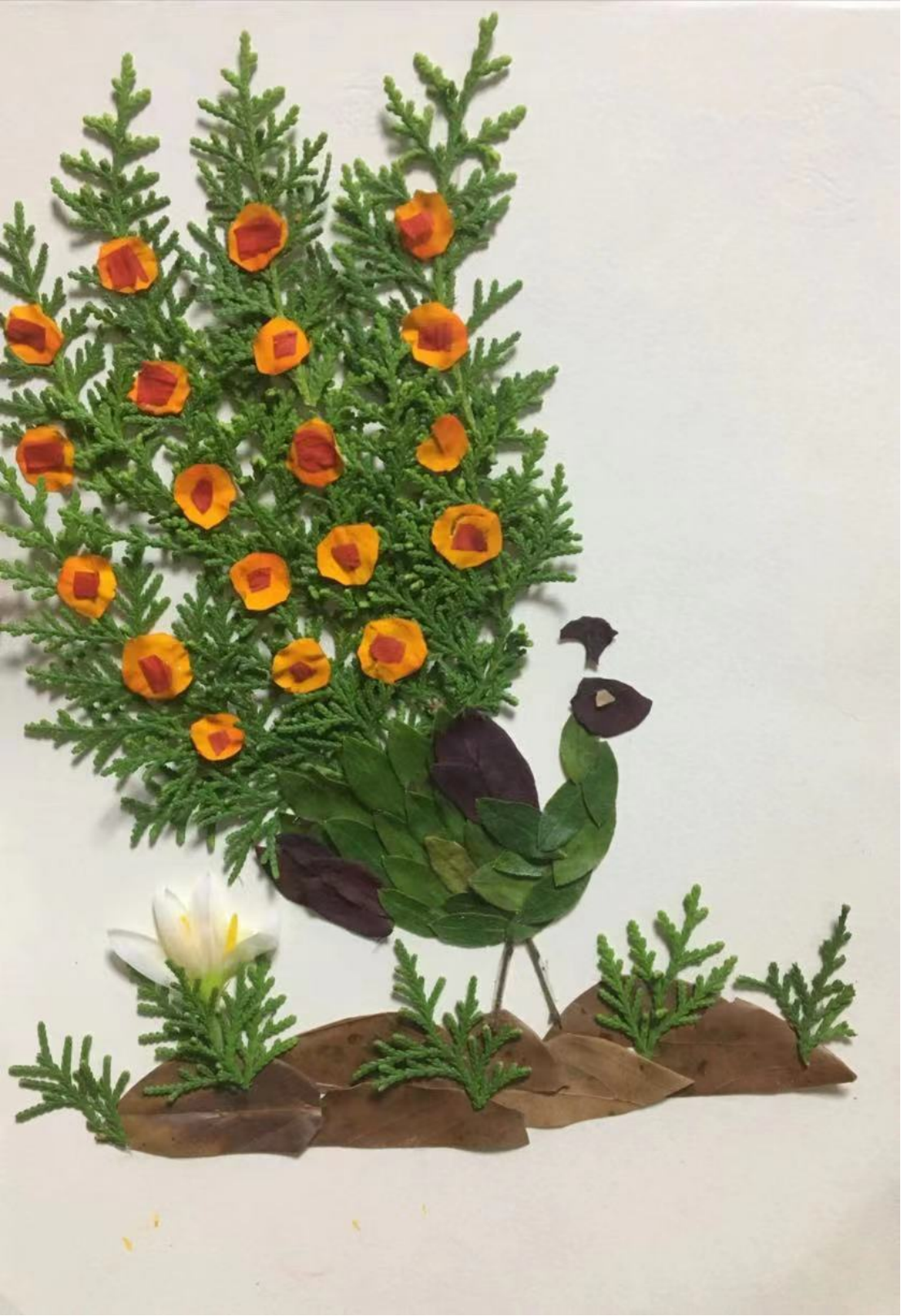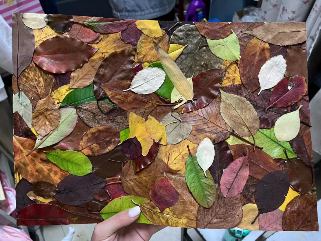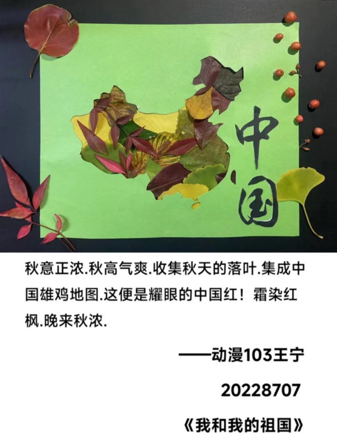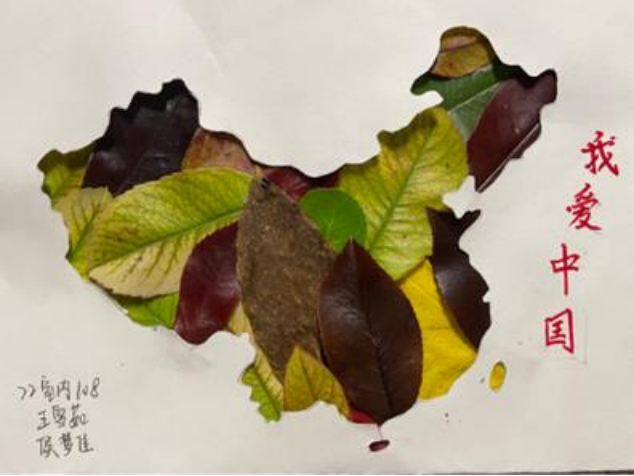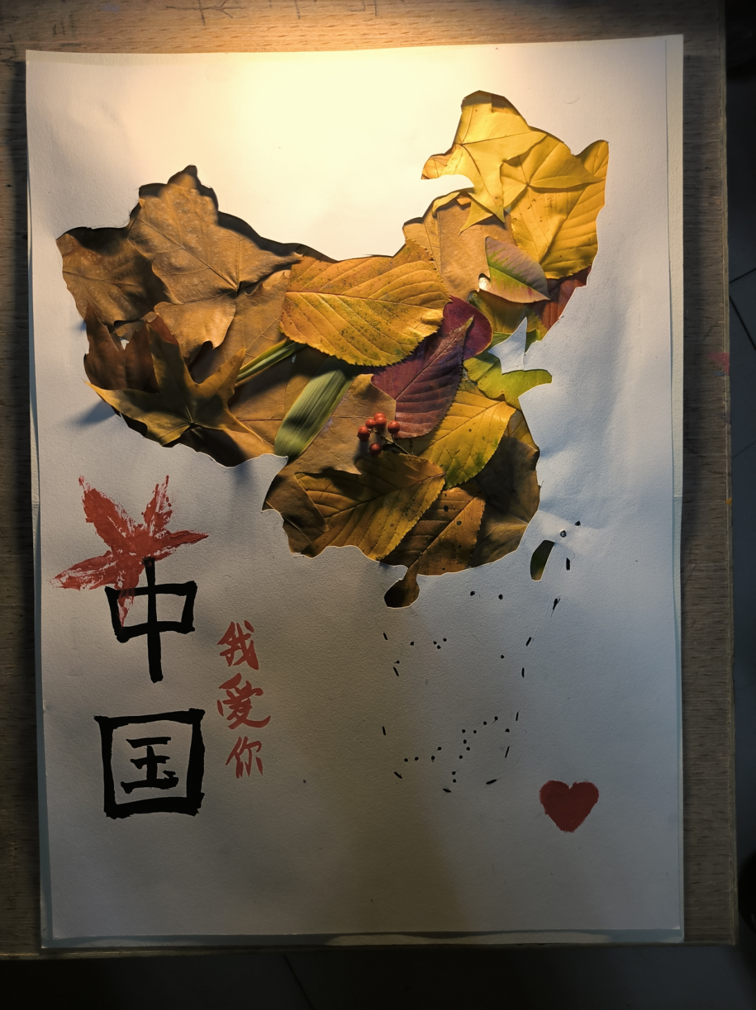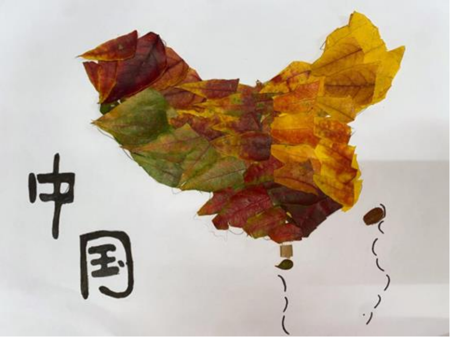 除此之外,同学们还用树叶拼成地图,用生活中发现美的眼睛创造出一幅幅色彩斑斓的华彩中国。