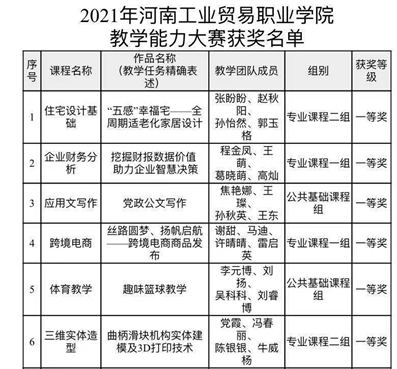按照河南省教育厅《关于开展2021年河南省高等职业教育教学竞赛活动的通知》的文件精神,在教务处的组织下,5月25日,历时一周的校教学能力大赛落下帷幕,此次大赛设有基础组、公共课一组、公共课二组,共16个代表队参赛,最终每组评选出2个一等奖作品参加省级复,我院张盼盼、赵秋阳、孙怡然、郭玉格四位老师组成的教学团队,获得一等奖的佳绩。