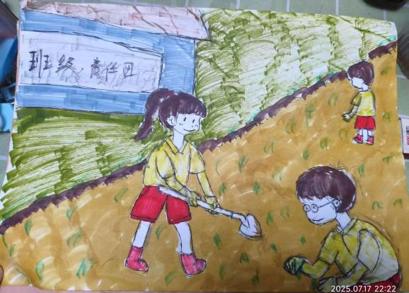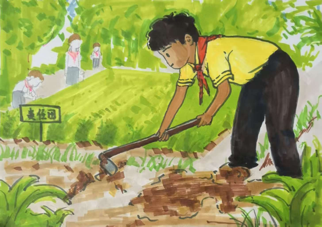 24数艺101刘梦柯说,这幅画展现校园“责任田”场景,戴红领巾的孩子挥锄劳作,传递劳动实践、责任担当的教育意义 。