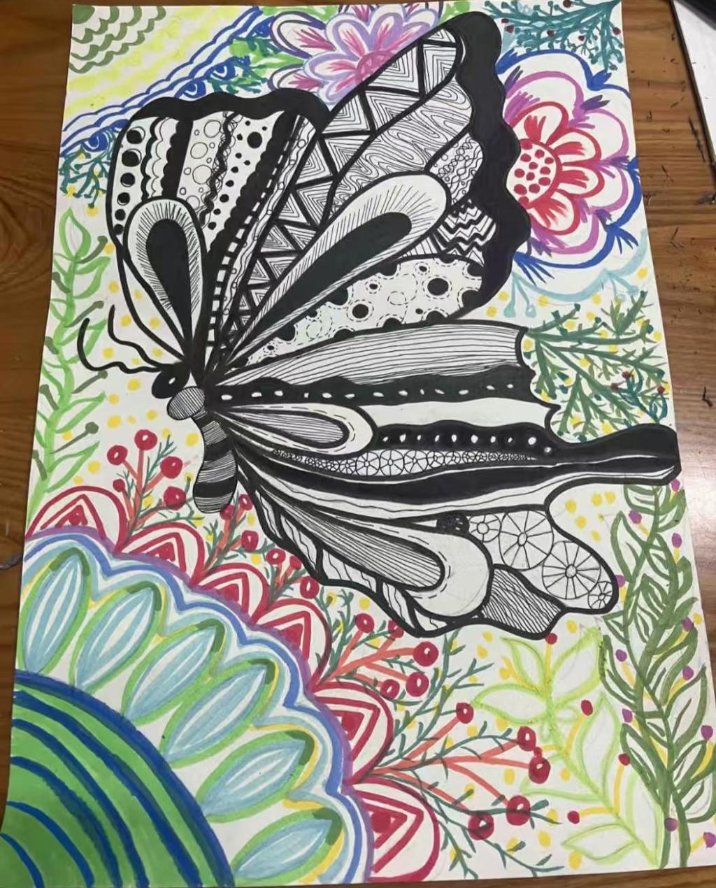 24广告103杨御坤说,这幅作品以黑白线描绘蝴蝶,多彩花草为衬,展现自然生机与创意 。