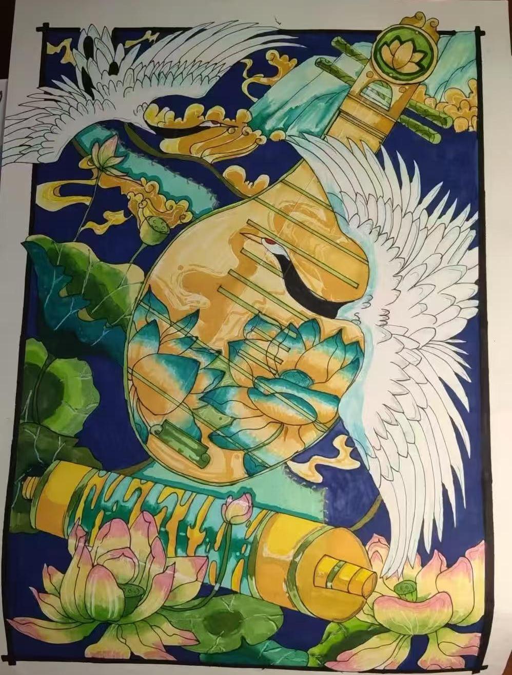 24广告104韩有苗说,这幅画以琵琶为中心,仙鹤莲花点缀,色彩绚丽,展现国潮古韵。