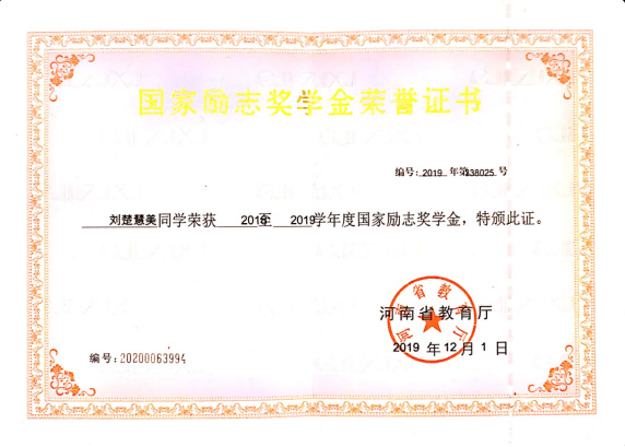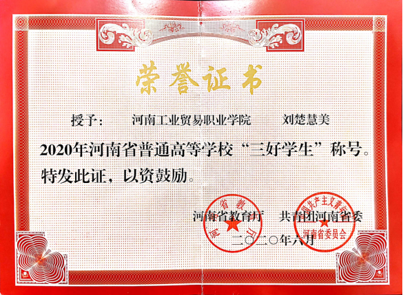 刘楚慧美,女,中共预备党员,河南工业贸易职业学院艺术设计学院2018级动漫制作技术102班学生,担任班级学习委员,院、系学生会委员。在校期间荣获国家励志奖学金、国家奖学金、河南省三好学生、优秀班干、工作标兵等荣誉。她诚实守信,热心待人,工作认真,思想觉悟高。在这三年的大学生活中,她在思想、学习和工作等方面都取得了优异的成绩。