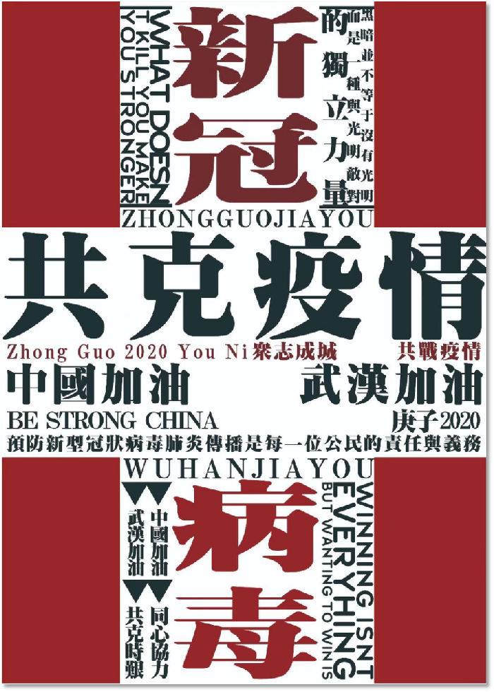 作业介绍:以文字编排为图形的版式方法,展示疫情期间全国人民共同抗疫的精神状态。编排的方式采用中轴式加满版式,一方面体现了我泱泱大国的秩序感,另一方面展示了万民共抗的状况。图形来源于红十字,色彩采用红白对比,反应了疫情的严重性以及我们抗疫的决心。细节方面,文字的内容包含很多抗疫时期的信息,是一副不错的作业。