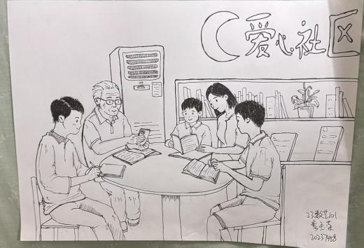 23数艺101的李玉荣说,这幅作品体现了社区的温馨和谐,男女老少围坐,展现社区生活的温暖融洽,传递邻里互助、共处的美好 众人阅读、交流,体现社区对文化建设的重视,营造爱读书的环境 不同年龄层同处,打破代际隔阂,彰显代际间学习陪伴的温情。