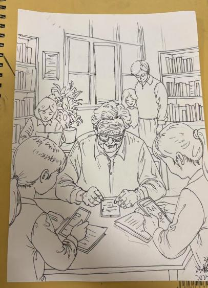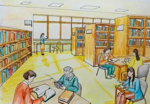 23室内101的唐佳艺说,这幅画呈现了图书馆内的温馨场景,不同年龄的人们以不同方式在知识空间里静享阅读时光。