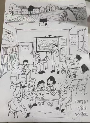 23数艺101的韩果说,这幅作品是一幅手绘场景图,展现了一间乡村文化活动室的热闹景象:室内外空间结合,上方勾勒出乡村田野、房屋,营造质朴环境;室内布置有书架、投影设备,呈现文化学习场所属性。