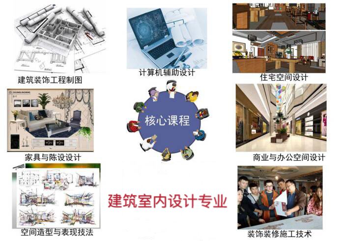 设计素描、设计色彩、构成设计、室内设计原理、室内装饰材料、3dmax、AutoCAD辅助设计、Photoshop、效果图技法、模型制作、家具设计、室内专题设计。