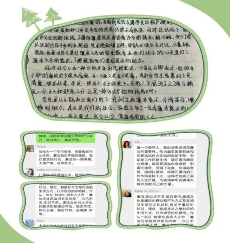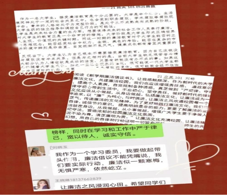 大学生要把廉洁作为一种高尚的人生追求、一种自觉的价值追求、一种科学的生活方式。为抵制腐朽文化的侵蚀,构建清廉校园,实现反腐倡廉教育经常化、规范化和制度化,使学生养成廉洁自律的良好作风,河南工业贸易职业学院应用外语学院全体学生积极响应校纪委的廉洁倡议,纷纷撰写心得体悟,立足学习生活实际,进一步畅谈如何树立当代大学生的道德高线、坚守纪律底线、强化纪律意识,积极参与廉洁反响征文活动。