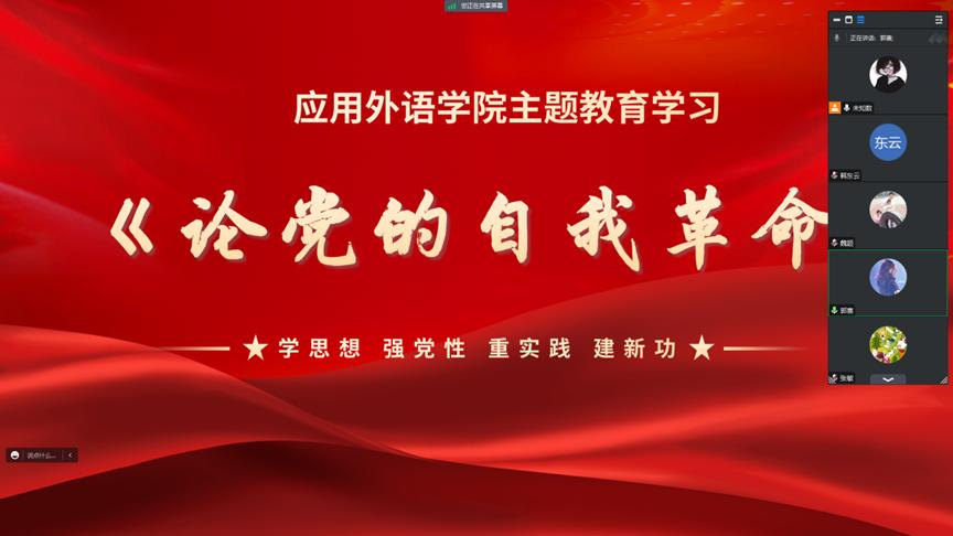 为深入学习贯彻习近平新时代中国特色社会主义思想主题教育及习近平总书记关于党的自我革命的战略思想,应用外语学院教师党支部于7月31日召开了“论党的自我革命”线上主题教育学习活动。会议由应用外语学院教职工党支部书记顾佳主持,全体党员教师参加。