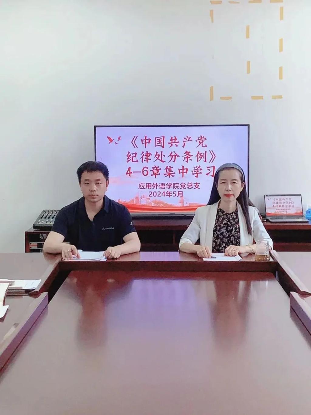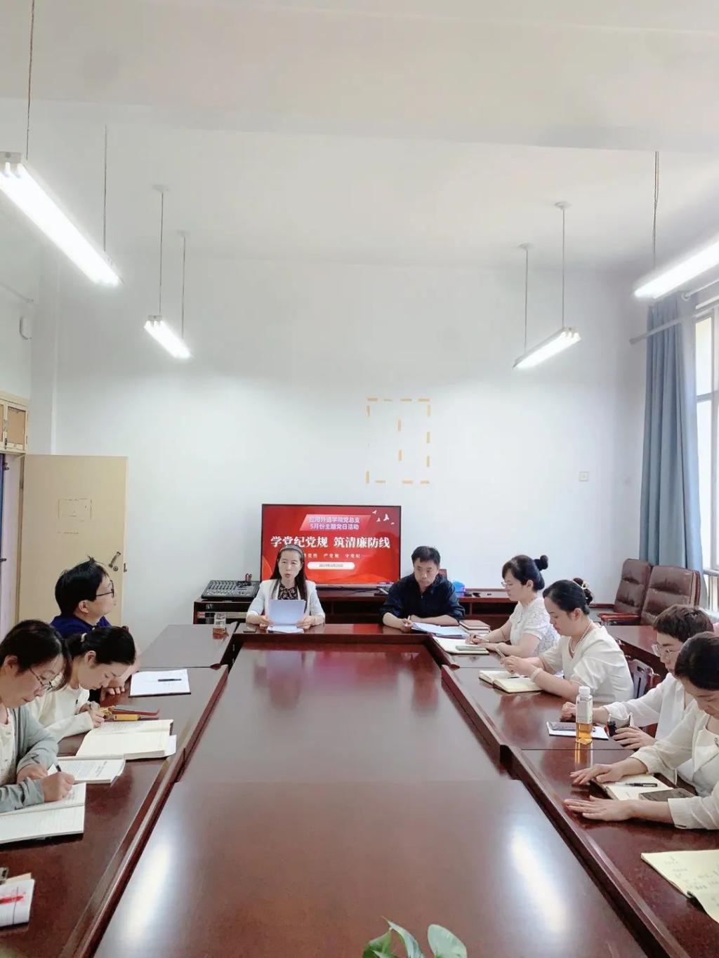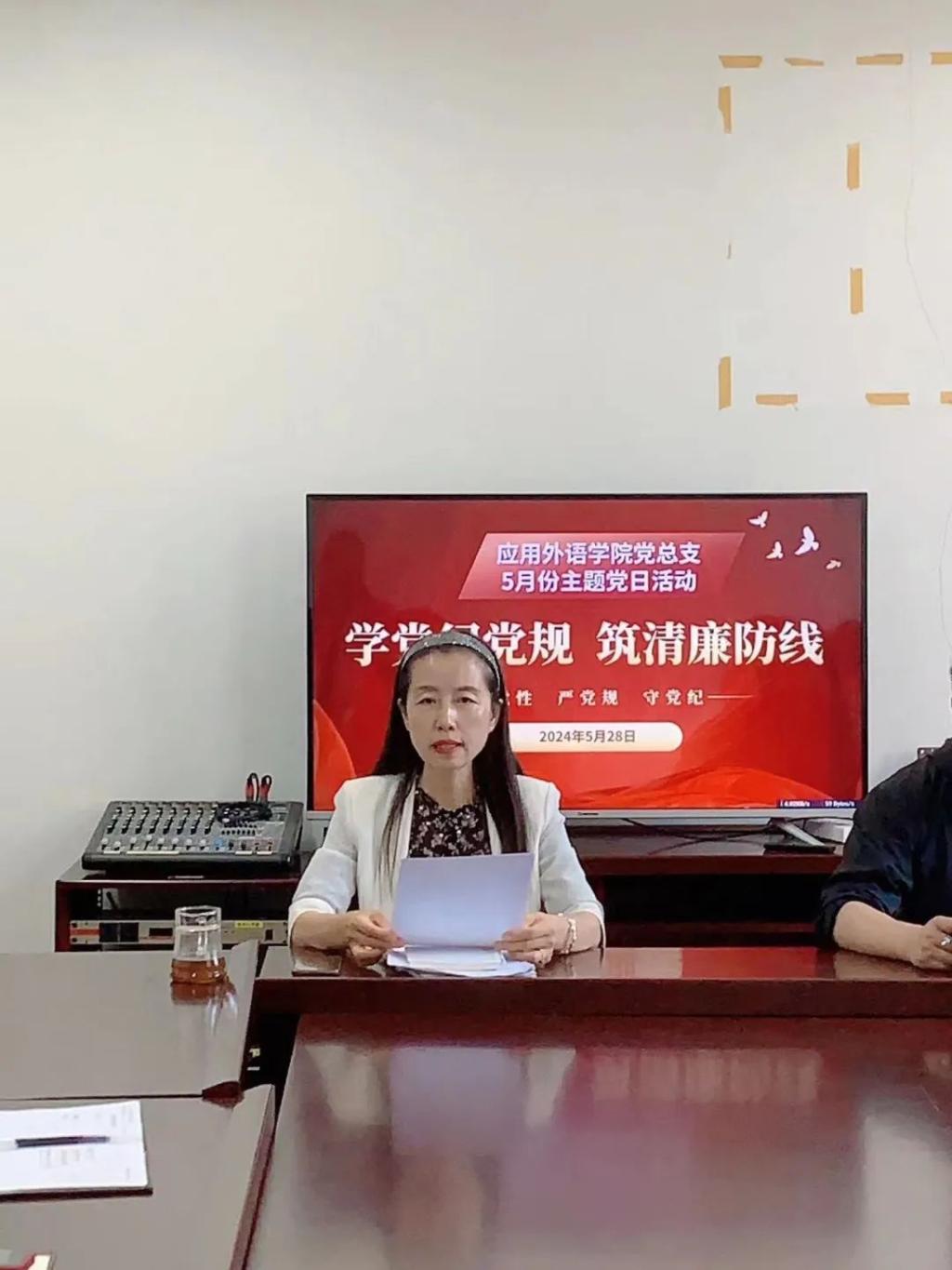 为深入学习贯彻新修订的《中国共产党纪律处分条例》,引导广大党员教师牢固树立党规党纪意识,坚守纪律底线,营造学院风清气正的良好氛围,应用外语学院党总支于5月28日下午在会议室开展“严守党纪党规,筑牢廉洁防线”主题党日活动,教职工党支部书记顾佳同志主持会议,应用外语学院全体党员教师参加了本次活动。