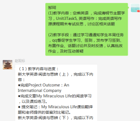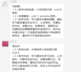 为保证网络教学质量和秩序,应用外语系也通过各种方式对老师们的教学情况进行了督导。每周末,所有任课教师会进行一次微信会议,交流本周教学成果以及反思,确保了网络教学的有序开展。在保障教学方面,一是发挥学生干部作用,让学生干部协助任课教师组织同学进入网上学习课堂。二是任课教师每天反馈上课情况,明确每节课使用的平台、采取的授课方式、学生签到情况、网络教学特色截图、教学反思等,以便进一步改进教学方法。