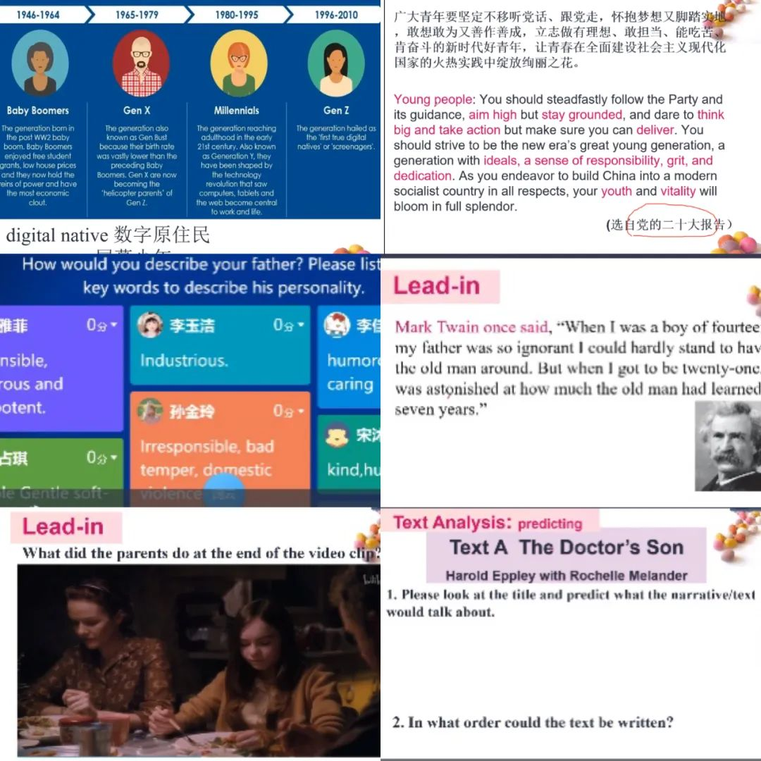 在层次丰富的授课过程中,郭赛老师专业细致,与同学们分享了满满的干货。首先在复习回顾环节,郭赛老师将表示“青年、青少年”的英文单词与二十大报告中的青年寄语双语版相结合,在专业知识教学中巧妙融入了思政元素。随后,在导入环节,郭赛老师通过“用三个单词描述大家心目中的父亲”这一话题大大激发了学生对本单元的兴趣,同时在与学生互动的过程中穿插相关单词教学,既引发了学生思考,又拓展了学生的词汇量。之后,郭赛老师通过引用马克吐温对“父亲”的描述无缝衔接到了课本内容,在讲解文章细节的过程中穿插播放电影《怦然心动》片段,并设置问题引导学生思考、讨论,对教学内容进一步升华。整堂课下来,郭赛老师丰富详实的教学内容对学生来说宛如一场丰盛的知识盛宴。