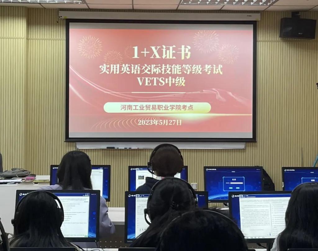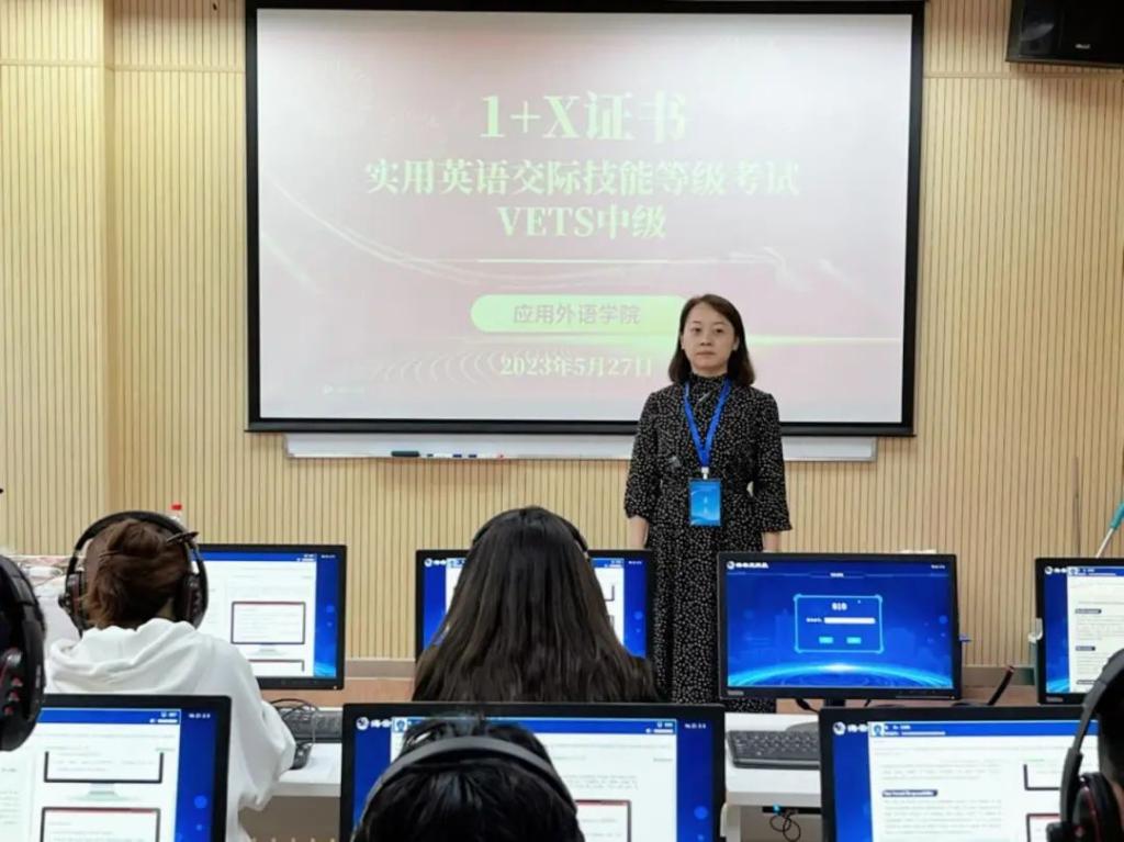 实用英语交际职业技能等级证书(Vocational English Test System),简称VETS,由北京外研在线数字科技有限公司(简称外研在线)研发,是教育部职业教育发展中心受权发布参与1+X证书制度试点的职业技能等级证书,考查和认定职业教育在校生、毕业生和社会成员在职场使用英语完成工作的技能水平,考试任务涵盖“事务安排、产品操作与研发、客户服务、业务推广、商品交易”五大典型工作领域,设置真实职场情境,以成果为导向,引导考生高效产出,旨在培养更多具有家国情怀的高素质国际化复合型技术技能人才。为保证考试顺利举行,应用外语学院在校党委的正确领导下,在职业技能鉴定中心等相关部门的大力支持下,在院长范勇慧、副院长张喆的领导下,精心准备、周密部署。VETS考试设定职场情境,采用机考。为确保考试的公开、公平、公正,考前,学院专门召开考务培训会,明确工作职责,细化工作流程,并按照考试要求布置考场、安装监控、测试机房、封闭考场。