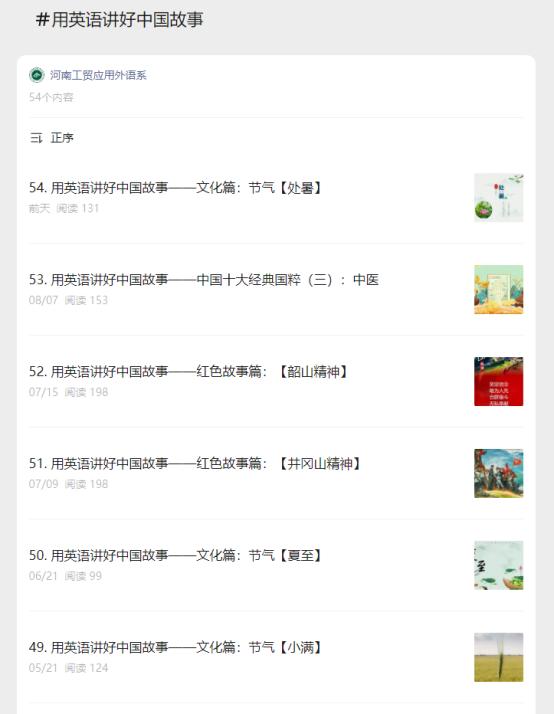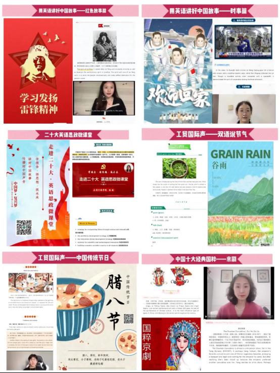 2021年,河南工业贸易职业学院集合应用外语学院骨干师生、外籍教师、校英语协会成员的力量,成立“用英语讲好中国故事”工作室,利用微信公众平台,从传统文化、红色故事、时政热点三个主题系统化双语展示中华文化,传播中国声音,打造出了“用英语讲好中国故事”线上栏目,以及“二十大英语思政微课堂”“工贸国际声:双语说节气”“工贸国际声:中国传统节日”“中国十大经典国粹”四个子栏目。栏目面向当代青年学生讲云端故事,从话题的挑选、素材的使用,到录音和影像的录制,再到排版完成,均由工作室师生亲自参与,制作精良,成为学校推广中华文化的优秀成果。
