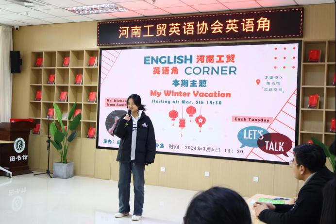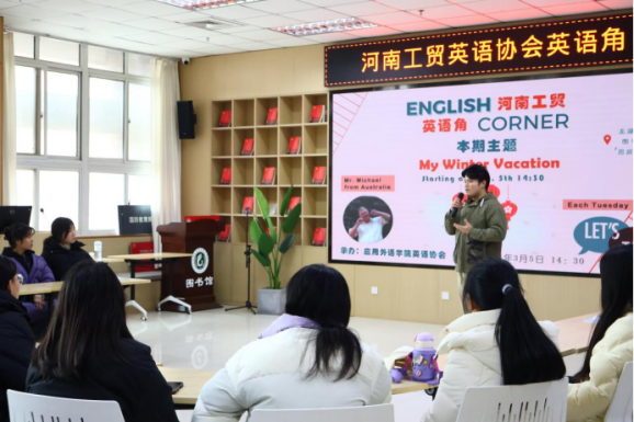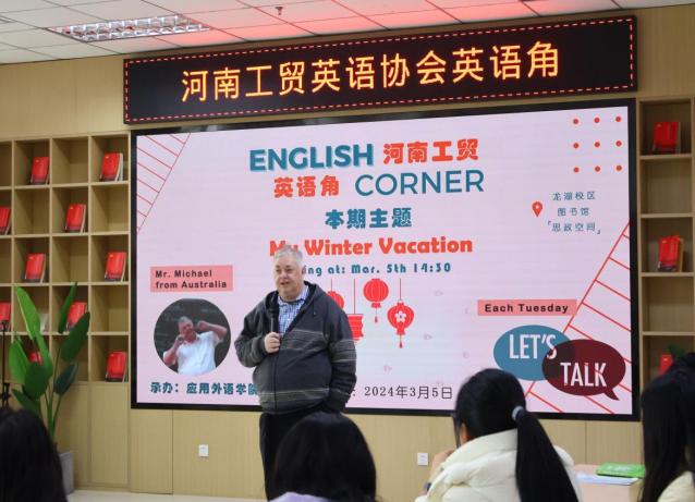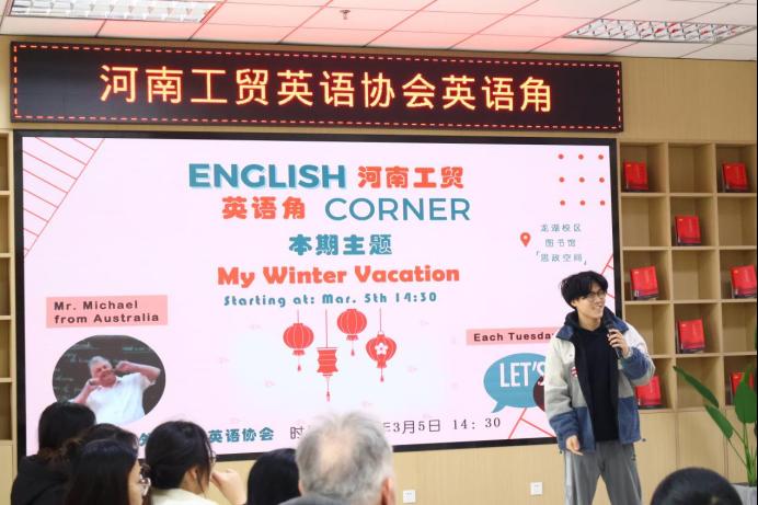 2024年3月5日下午,新学期工贸第一期英语角活动在龙湖校区图书馆火热举行。此次活动以《我的寒假》为主题,应用外语学院英语协会主办,活动吸引了外教Michael以及50多名英语爱好者的积极参与。活动旨在通过分享寒假经历,增进同学们之间的了解,同时提高英语口语表达能力,探索英语学习的新境界。