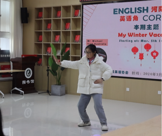 在接下来的环节中,同学们两人一组,互相分享了自己的寒假经历。他们谈论了寒假期间的旅行、学习、家庭团聚等各种活动,用英语交流彼此的故事和感受。这个环节不仅锻炼了同学们的英语口语能力,也增进了同学们彼此之间的了解。在活动的最后阶段,几位同学勇敢地走上了台前,分享了他们各自不同的寒假生活。应用外语外语学院的郭欣欣同学讲述了与家人一起旅行的欢乐时光,来自机电学院的张喆同学谈到了在寒假期间参加社会实践活动的收获,来自粮食工程学院的李菁菁同学给大家展示了她的太极拳表演。这些精彩的分享让在场的同学们感受到了寒假生活的丰富多彩以及工贸学子追求个人成长的热情。