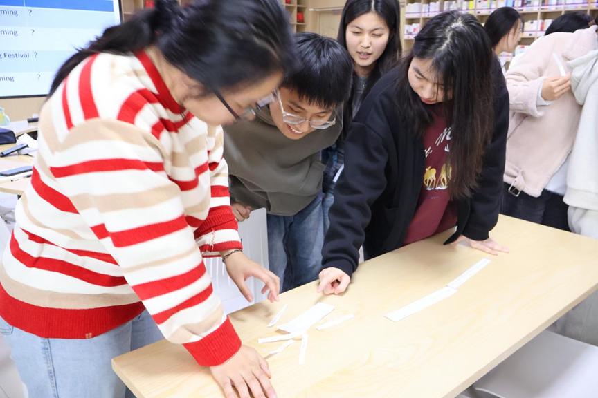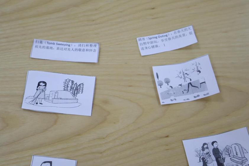 接下来就是最好玩的互动环节,英语协会负责人把清明节相关信息截成几十个小纸条发给现场的小伙伴。大家需要根据前面主持人的分享和小纸条来找队友,组成不同主题的8人小组。这个环节不仅考验了大家的团队协作能力,也让大家在轻松愉快的氛围中更加深入地了解了清明节的传统习俗、历史渊源等传统文化知识。