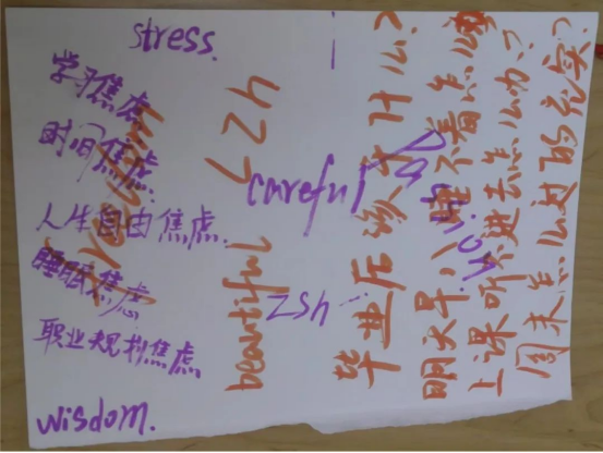 在小组讨论环节,同学们分组合作,在一张纸上写下各自面临的压力,并讨论应对方法。讨论结束后,各小组代表依次上台分享,内容涵盖学业压力、时间管理、人际关系等多个方面。同学们纷纷表示,通过交流不仅缓解了压力,还学到了许多实用的应对技巧。