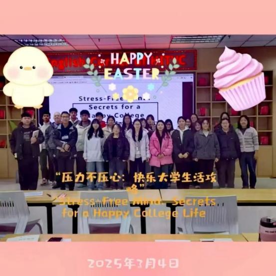 本次活动在轻松的集体正念冥想中圆满结束。通过本次活动,同学们不仅提升了英语表达能力,还学会了如何更好地应对大学生活中的压力,为营造快乐的大学生活指明了方向。