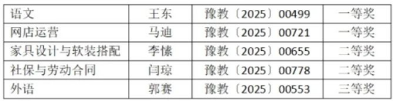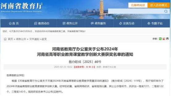 近日,河南省教育厅办公室发布了《关于公布2024年河南省高等职业教育课堂教学创新大赛获奖名单的通知》(教办职成〔2025〕46号),我院教师郭赛荣获公共基础课程组三等奖。