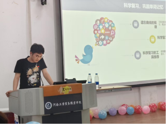 随后,来自机电工程学院的特邀嘉宾2023级同学刘国贵为大家带来了英语学习经验分享。该同学前不久代表学校参加2025年第五届“外教社词达人杯”全国大学生英语词汇能力大赛获得了河南省赛区一等奖的好成绩,他从词汇积累的巧思,到口语提升的诀窍,干货满满的内容,既是知识的传递,更寄托着对2023级学子在实习中继续深耕专业的期许,让大家明白,即便踏上实习岗位,学习的脚步也不能停歇。