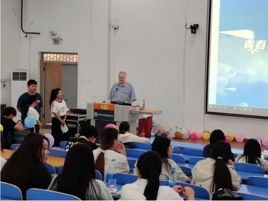 最后外教老师Michael上台致辞,他高度评价了这一学期举办的英语角活动,表达了自己印象最深刻的一次是端午节的主题活动,并对即将实习的学长学姐们给予热情的鼓励,希望2023级同学们在实习期间锻炼实践技能的同时也要注意劳逸结合,在场的同学们都深受感动。