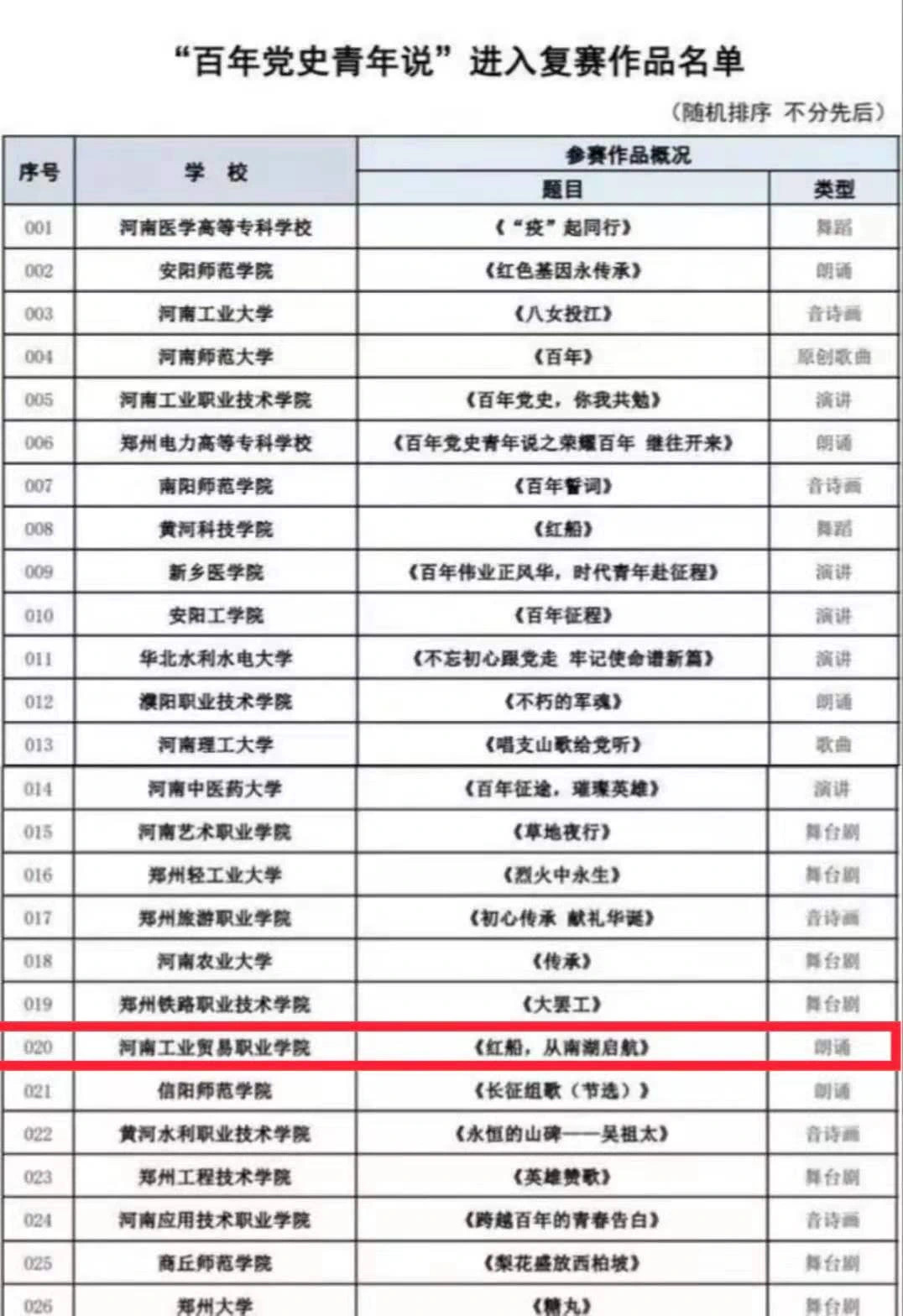 由应用外语学院张艳华老师和范志琪老师指导、19商英102班黄振博同学朗诵的作品《红船,从南湖启航》,入选该赛事复赛阶段,见下图020号作品,赛事从5月1号至5月7号进入展播、投票阶段,请全校师生为我校的作品投上宝贵的一票!